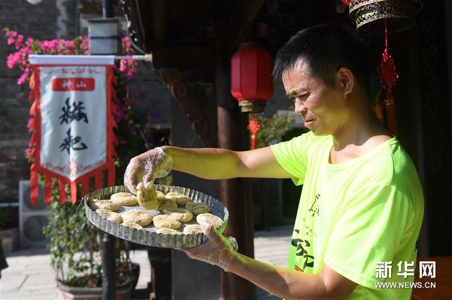 在江西省安义县石鼻镇水南村,一家商铺员工把刚刚制作好的糍粑装入盘子准备销售(8月8日摄)。 安义千年古村群位于江西省南昌市安义县石鼻镇境内,距今已有1400多年历史,由罗田、水南、京台三个村落组成,是典型的赣商文化古村落。目前,古村群保留有120多栋相对完整的明清古宅,先后被评为中国历史文化名村、全国农业旅游示范点、江西十大最美乡村之一。 2017年8月,当地引进企业对千年古村群进行整体规划建设与运营管理。目前,安义千年古村群已初步建成集赣文化与赣商文化体验、旅游休闲于一体的文化旅游村落。2018年,古村共接待游客近20万人次,村民人均纯收入从2015年的千元左右,提高到2018年底的万元左右,古村焕发新生机,带动了村民增收。 新华社记者 陆波岸 摄