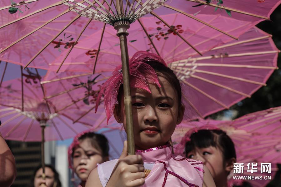 8月11日,小演员在巴西圣保罗市保利斯塔大街表演舞蹈。 “《我和我的祖国》中华文化快闪活动”11日在巴西圣保罗市保利斯塔大街举行。百余名华侨华人和巴西民众观看了演出。 新华社发(拉赫尔·帕特拉索摄)