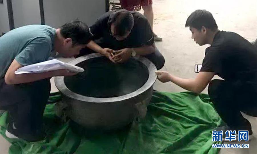 警方在兰州市西固区河口镇一仓库内截获文物“鉴盆”(8月8日摄)。 近日,兰州市公安局协助山西省警方侦破一起文物倒卖案件,涉案文物名为“鉴盆”,系西周晚期青铜器。 新华社发 (兰州市公安局新闻办 供图)