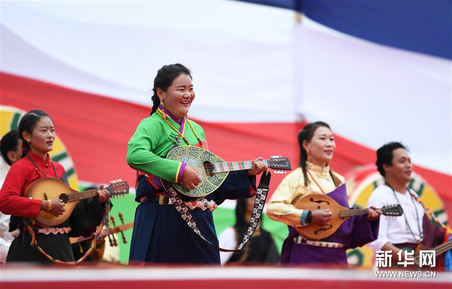 8月13日,演员在赛马节开幕式上表演民间弹唱。 当日,第十二届格萨尔赛马节在甘肃省甘南藏族自治州玛曲县拉开帷幕。本届赛马节为期6天,共有来自西藏、青海、内蒙古、四川、甘肃等省区的52支队伍900多匹赛马参加速度赛和耐力赛等项目的比赛,期间还将举办草原音乐节、马术表演、民间弹唱等活动。 新华社记者 王化娟 摄