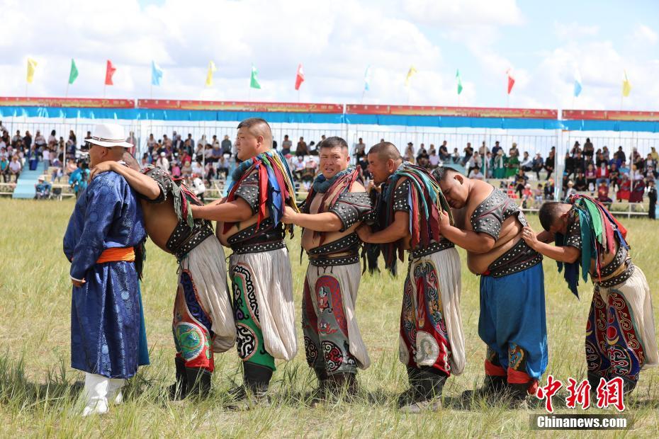8月13日,“四季乌珠穆沁”金秋那达慕暨蒙古搏克超级联赛总决赛在内蒙古自治区东乌珠穆沁旗开幕,除了那达慕的传统项目骑马、射箭和搏克以外,还将举办东乌珠穆沁旗第九届“乌珠穆沁羊节”以及招商引资推介会等活动。图为搏克手们排队准备登场比拼。中新社发 钟欣 摄