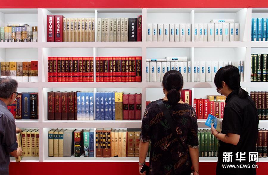 8月14日,读者在2019上海书展上参观新中国成立70周年辞书成就展。 当日,2019上海书展在上海展览中心开幕,全国500多家出版社的16万余种图书参加展销。书展期间,阅读活动、新书签售、作家研讨、讲座等众多活动将在上海展览中心和百余个分会场同步举行。 新华社记者 任珑 摄
