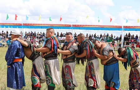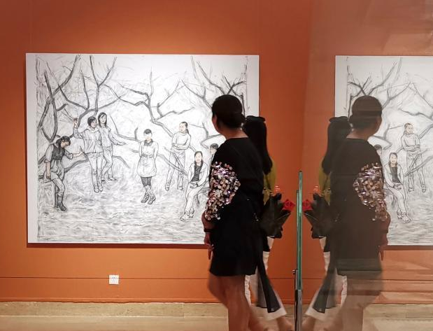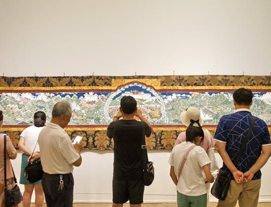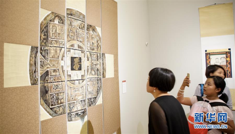 8月15日,观众在中国美术馆参观展出画作。 当日,作为中国美术馆对口支援西藏文化建设扶持项目的“雪域祥云——西藏布面重彩画展”在北京中国美术馆开幕,共展出13位艺术家具有西藏传统艺术特色的布面重彩美术作品50余幅。 新华社记者 李欣 摄