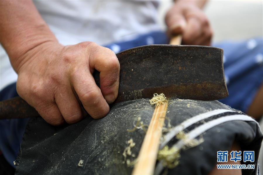 8月15日,泾县丁家桥镇小岭村村民刮去竹片上的皮层。 新华社记者 刘军喜 摄