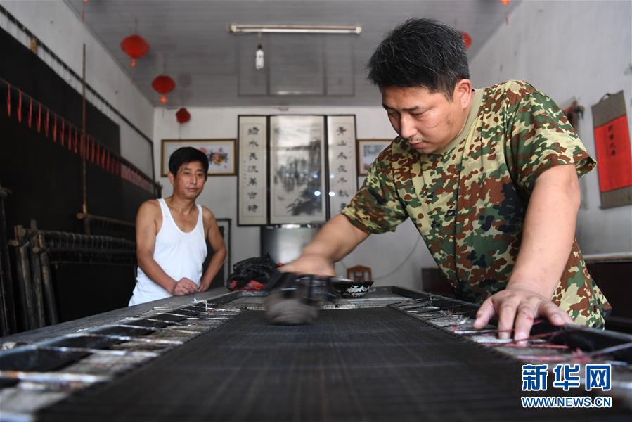 8月15日,泾县丁家桥镇小岭村村民在宣纸帘上刷漆。 新华社记者 刘军喜 摄