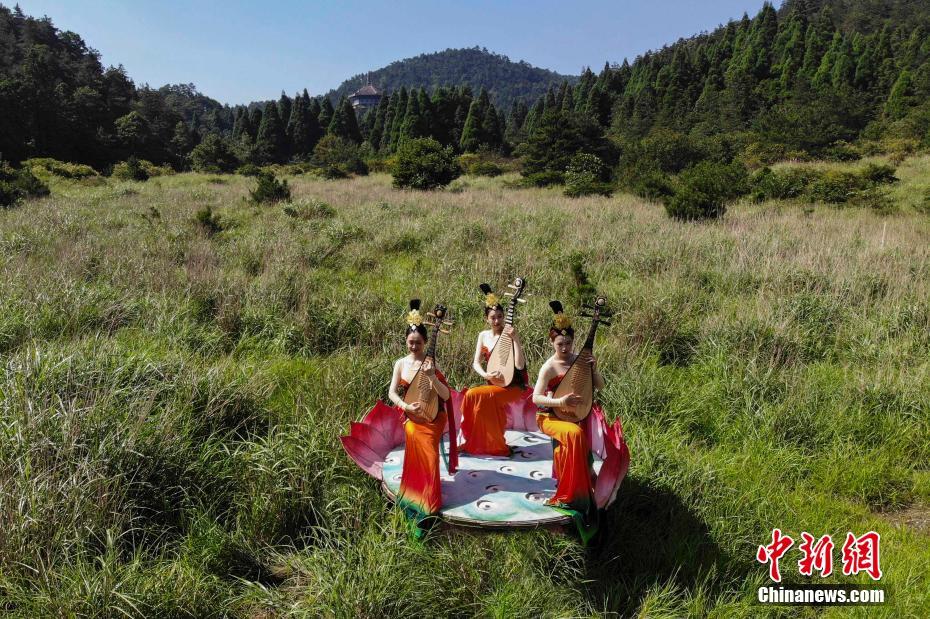 8月18日,长三角第一高峰浙江龙泉山举办了一场高山草甸古风音乐会,宋城艺术总团的演员手持琵琶、古筝、箫等乐器,在海拔1600余米的高山草甸上挑战各种高难度动作演奏,为前来的游人献上了一场精彩的视听盛宴。王其威 摄