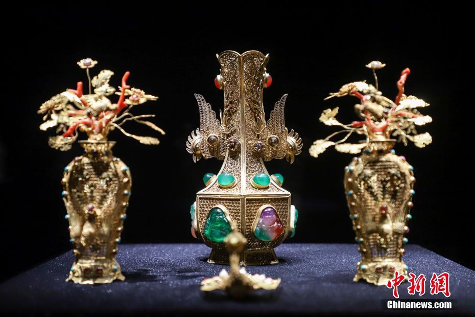 贵州独山毋敛古风博物院位于贵州省黔南布依族苗族自治州独山县,于2019年8月8日开园。博物院主要以乐殿博物馆、如意苑博物馆、金银器博物馆等系列专馆和文化交流中心组成。先期开放的乐殿博物馆和如意苑博物馆展出藏品1300余件,为唐、明、清等朝代的青铜器、陶瓷、金银器皿等。 图为贵州独山毋敛古风博物院展出清朝的“金累丝镶宝玛瑙盆景”(中)和“金累丝镶宝珊瑚凤纹花插”展品。瞿宏伦 摄