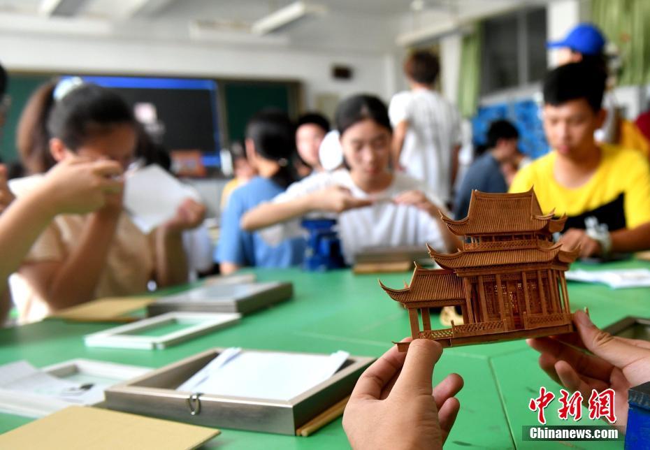 8月21日,两岸的青年学子在福州金山中学体验福州软木画制作工艺。作为第七届海峡青年节系列活动之一,第十六届榕台青年夏令营20日在福州开营。台湾新竹高中、竹北高中及马祖高中和福州金山中学推举的85名学生参加,其中台湾青年49人。中新社记者 吕明 摄