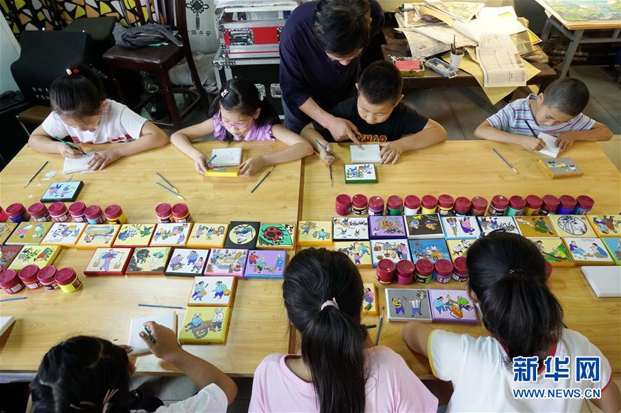 8月22日,孩子们在河北省辛集市农民画创研中心学画农民画。 辛集农民画是河北省辛集市的民间传统艺术形式,历史悠久,属于河北省非物质文化遗产。近年来,辛集农民画在传统基础上,又将剪纸、吊挂、印染等本地元素融入画中,作品时代特征鲜明,生活气息浓郁。为了更好地传承这一传统技艺,河北省辛集市成立了辛集农民画创研中心,拓宽农民画及衍生品销售渠道,并通过“进校园”的方式为传统技艺“传薪”。 新华社记者 牟宇 摄