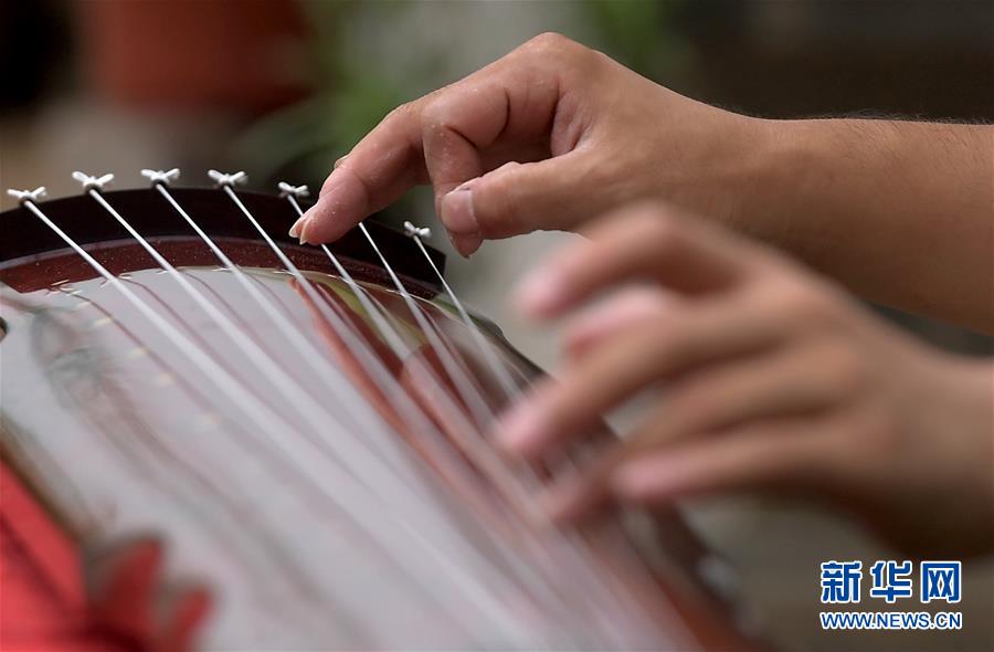 在河南省兰考县堌阳镇徐场村墨武琴坊内,徐冰在试弹(8月21日摄)。 新华社记者 李安 摄