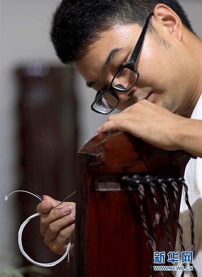 在河南省兰考县堌阳镇徐场村墨武琴坊展厅内,徐冰在上弦(8月21日摄)。 新华社记者 李安 摄