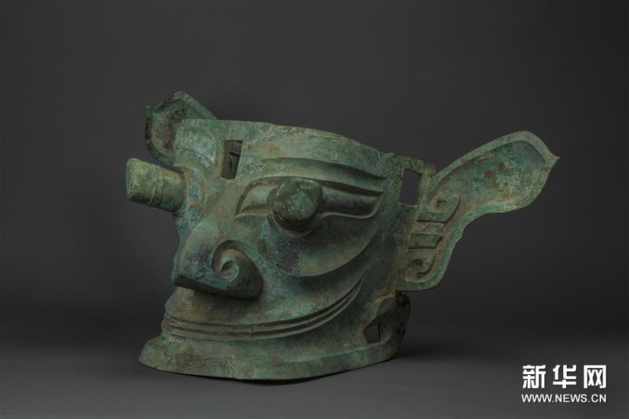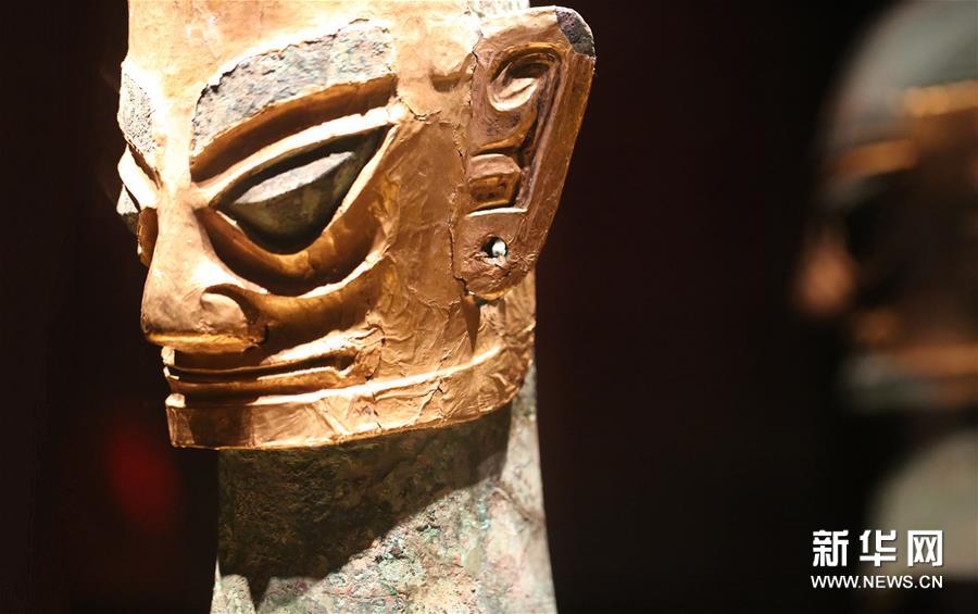 这是贴有黄金面罩的青铜人头像(4月27日摄)。新华社发(四川省文物局供图)