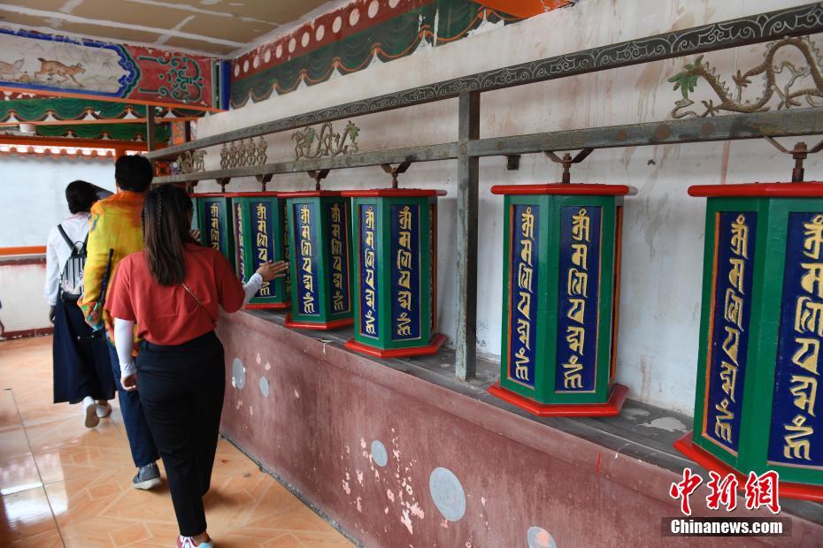 8月23日,广宗寺的黄庙周围,人们转动转经筒祈福。广宗寺位于内蒙古自治区阿拉善左旗,贺兰山西麓的一个山谷中。寺庙始建于1757年,是由班自尔扎布台吉之子阿旺多尔济遵照其师六世达赖喇嘛遗愿所建,曾供奉有六世达赖喇嘛仓央嘉措的法体。 中新社记者 刘文华 摄