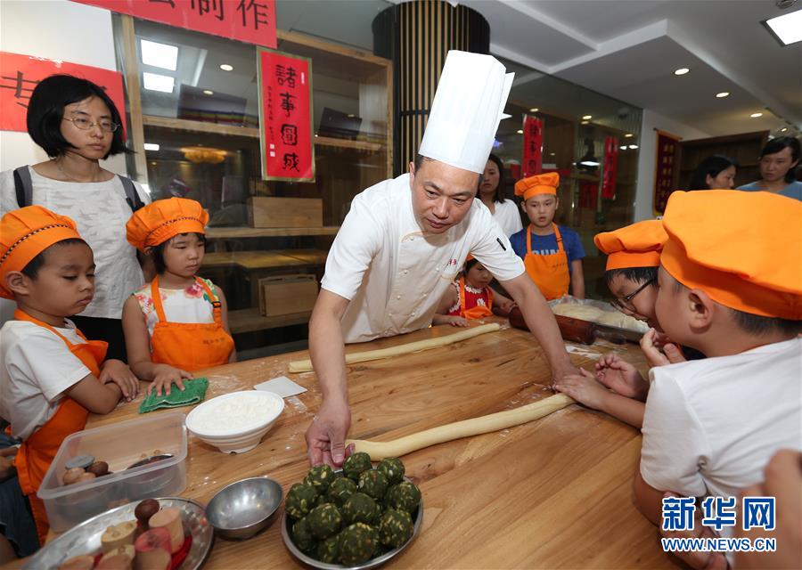 8月23日,龙华素斋首席技师刘锦久在给家长和孩子们示范月饼的制作工艺。新华社记者 任珑 摄