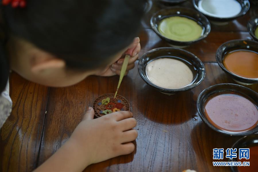 8月25日,在香河县北李庄村的乡村旅游非遗体验园里,小朋友学习体验景泰蓝制作技艺。新华社记者 鲁鹏 摄