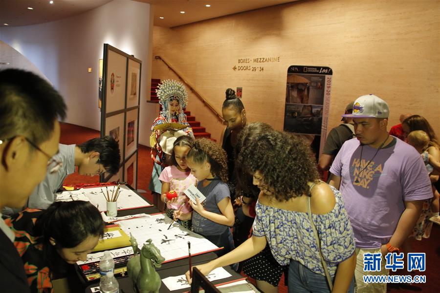 8月25日,在美国得克萨斯州休斯敦,人们在剧院开放日中国文化推介活动上学习使用毛笔。 中国驻休斯敦总领馆25日首次参加当地剧院开放日活动,通过书法和京剧向美国民众介绍中国文化。 新华社发(劳承跃摄)