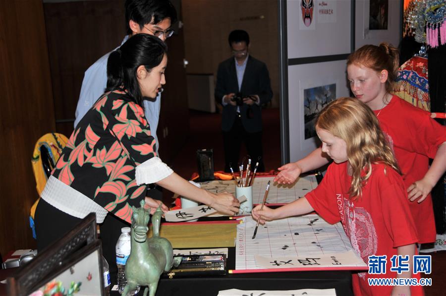 8月25日,在美国得克萨斯州休斯敦,一名儿童在剧院开放日中国文化推介活动上学习使用毛笔。 中国驻休斯敦总领馆25日首次参加当地剧院开放日活动,通过书法和京剧向美国民众介绍中国文化。 新华社记者 刘立伟 摄