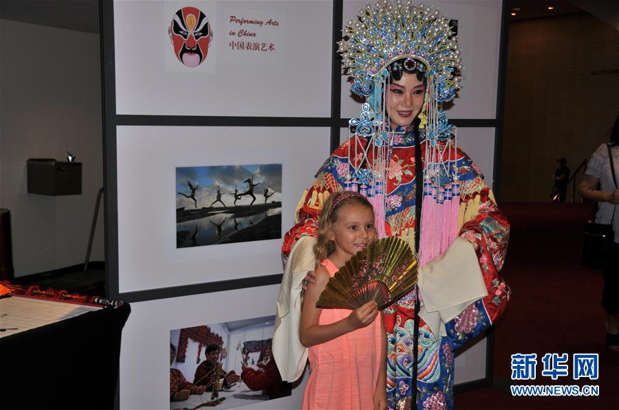 8月25日,在美国得克萨斯州休斯敦,一名儿童和中国京剧演员在剧院开放日中国文化推介活动上留影。 中国驻休斯敦总领馆25日首次参加当地剧院开放日活动,通过书法和京剧向美国民众介绍中国文化。 新华社记者 刘立伟 摄