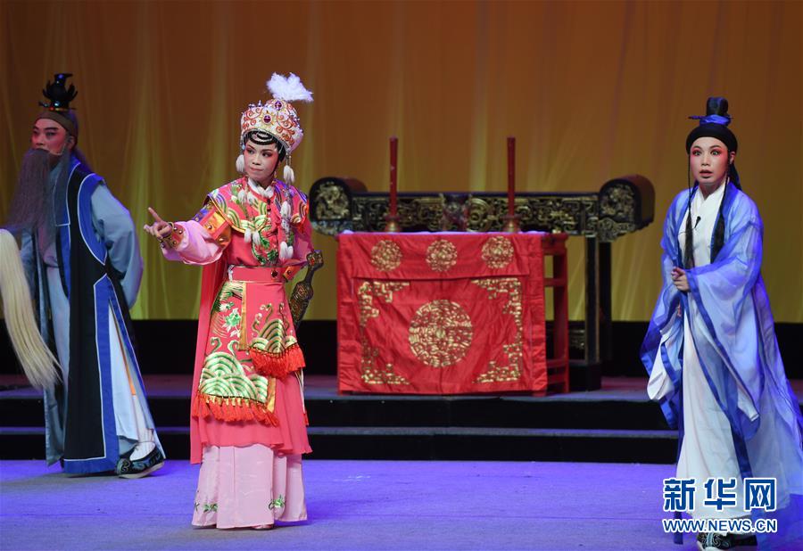 8月27日,在晋江戏剧中心,当地民间高甲戏剧团演员在表演高甲戏《八姐盗刀》。 新华社记者 宋为伟 摄