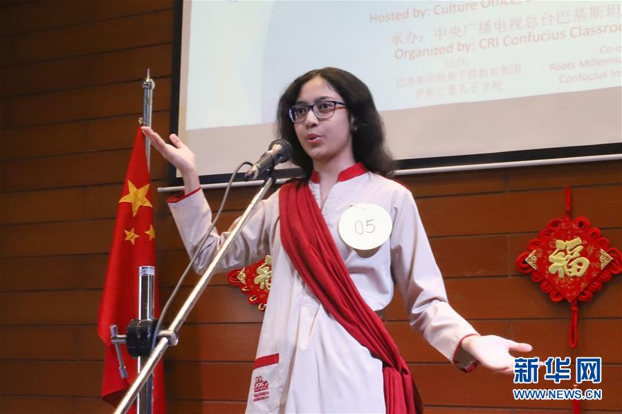 8月28日,在巴基斯坦伊斯兰堡,来自巴基斯坦根基千禧学校旗舰校区的高中生阿比哈·舒艾卜参加演讲比赛。新华社记者 蒋超 摄