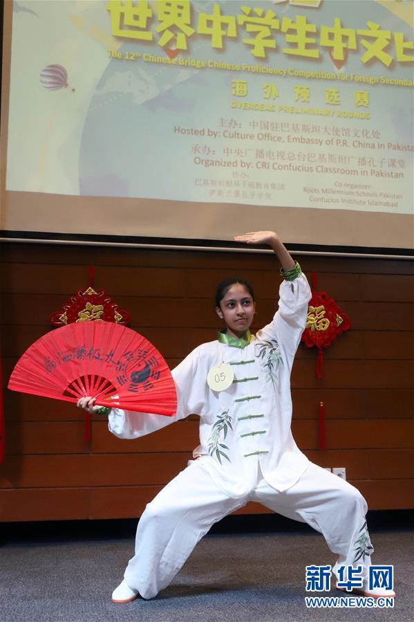 8月28日,在巴基斯坦首都伊斯兰堡,巴基斯坦根基千禧学校旗舰校区的高中生阿比哈·舒艾卜参加第十二届“汉语桥”世界中学生中文比赛海外预选赛巴基斯坦赛区比赛时表演《太极扇》。新华社记者 蒋超 摄