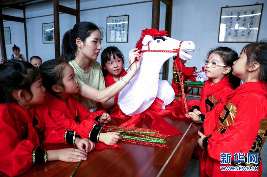 8月30日,长兴县开发区实验幼儿园的孩子们在观看传统马灯的制作过程。 当日,长兴县开发区实验幼儿园开展非遗文化进校园活动,邀请长兴县非物质文化遗产马灯传承人许明明向孩子们讲授马灯制作、锣鼓伴奏等传统技艺,让孩子们体验和传承家乡的传统民俗文化。下箬马灯是发源于浙江省长兴县的民间舞蹈,历史悠久。 新华社记者 徐昱 摄