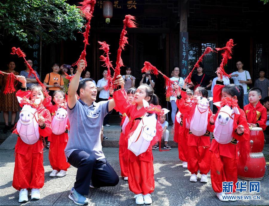 8月30日,长兴县非物质文化遗产马灯传承人许明明在教孩子们学习跳马灯舞。 当日,长兴县开发区实验幼儿园开展非遗文化进校园活动,邀请长兴县非物质文化遗产马灯传承人许明明向孩子们讲授马灯制作、锣鼓伴奏等传统技艺,让孩子们体验和传承家乡的传统民俗文化。下箬马灯是发源于浙江省长兴县的民间舞蹈,历史悠久。 新华社记者 徐昱 摄