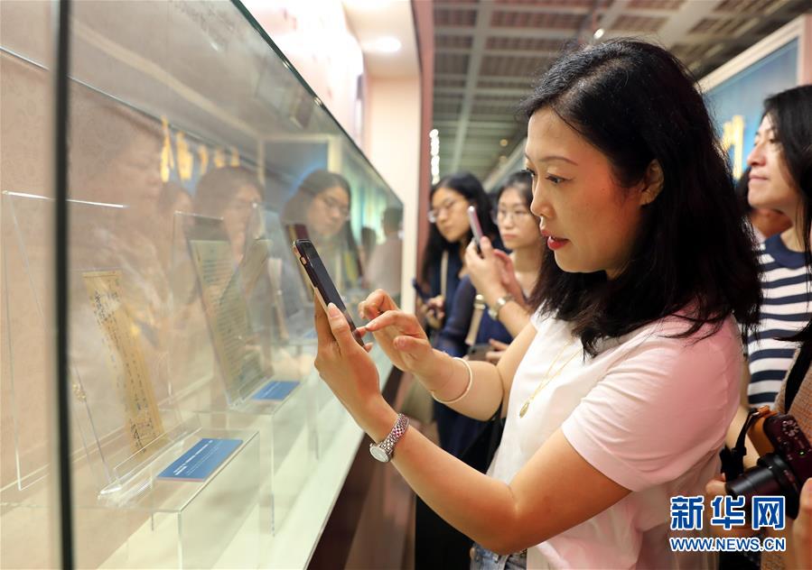 9月4日,观众在展览上拍摄展品。 当日,“为新中国奋斗——宋庆龄文物文献特展”在上海城市规划展示馆揭幕,展览集中呈现北京和上海两地与宋庆龄文物保护相关的6家机构的400余件珍贵文献、文物、照片等。 新华社记者 刘颖 摄