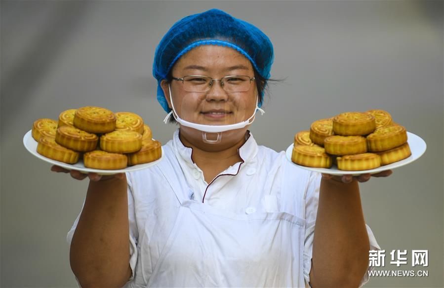 9月5日,河北安平县安平镇政宣村的老孟家传统手工月饼铺的师傅在展示月饼。 临近中秋,河北省安平县安平镇政宣村的老孟家月饼铺加紧赶制手工月饼,为当地百姓献上中秋传统美食。据了解,老孟家传统手工月饼铺已有三十余年历史,旺季时他们每天烤制月饼千余斤,其现制现卖、价格实惠、充满老味道的传统手工脆皮月饼受到当地百姓的欢迎。 新华社记者李晓果摄