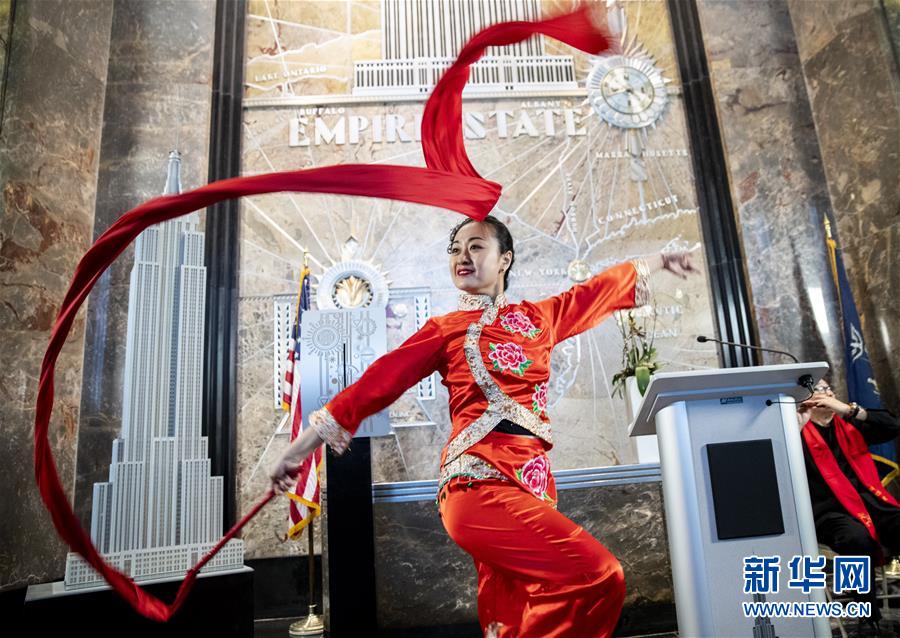 红色是中国传统的喜庆色彩。 每逢中国盛大节日,世界各地被“中国红”装点,因“中国红”熠熠发光;国际舞台热衷展现“中国红”的独特魅力,因“中国红”大放异彩;海外民众为“中国红”着迷,爱上中国文化...... 2019年2月1日,在美国纽约帝国大厦举行的中国春节点灯仪式上,演员表演中国特色舞蹈。 新华社记者王迎摄