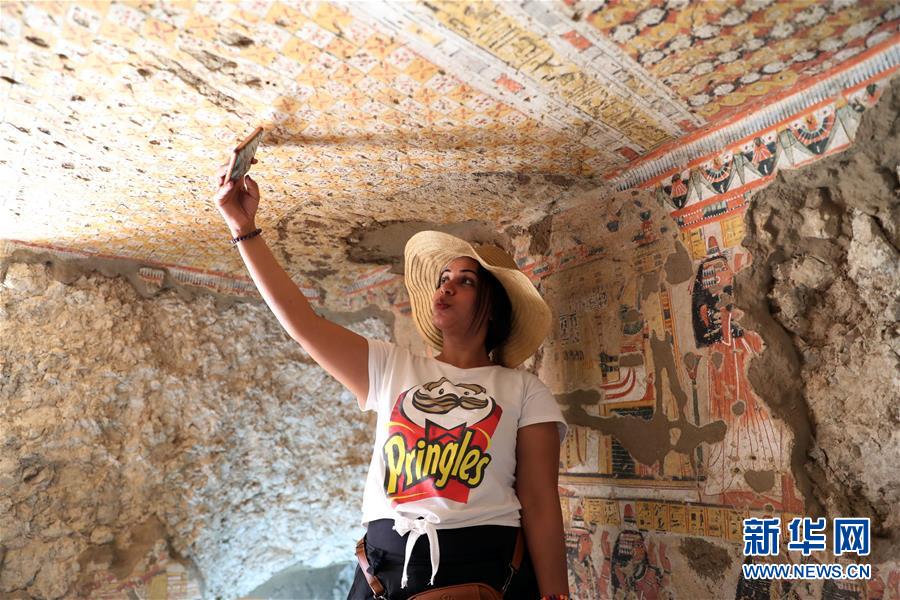 9月8日,在埃及卢克索,一名女子在一座古墓内自拍。新华社发(艾哈迈德·戈马摄)