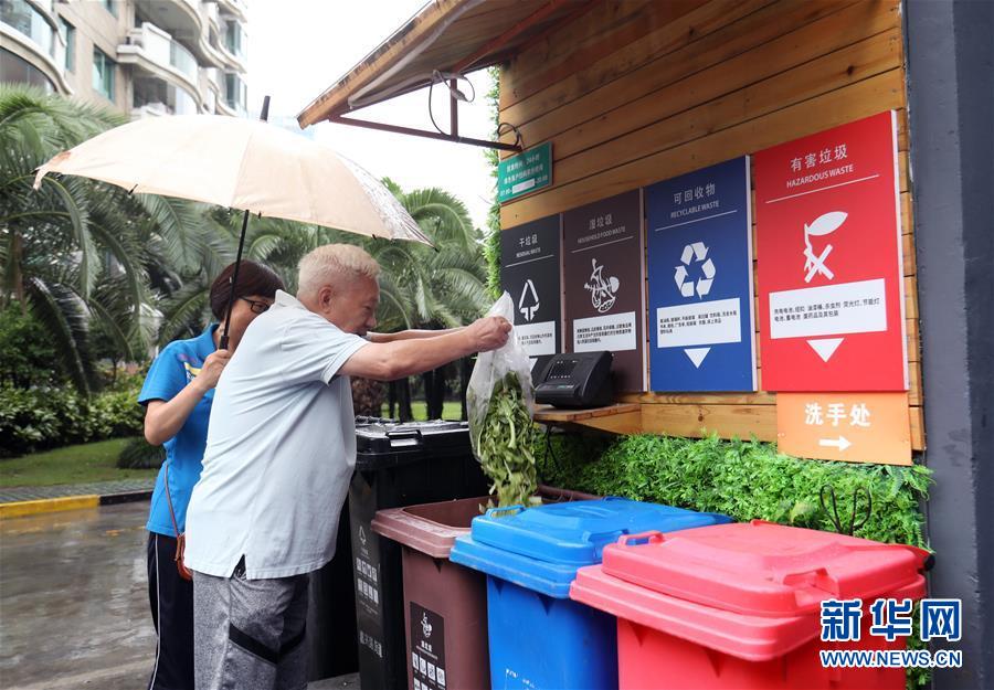 上海市虹口区宇泰景苑小区居民在对垃圾进行分类投放(8月29日摄)。新华社记者 刘颖 摄