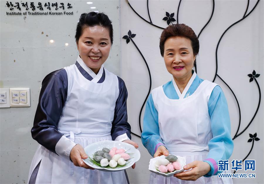 9月10日,在位于韩国首尔的韩国传统饮食研究所,所长尹淑子(右)和徒弟展示做好的松饼。