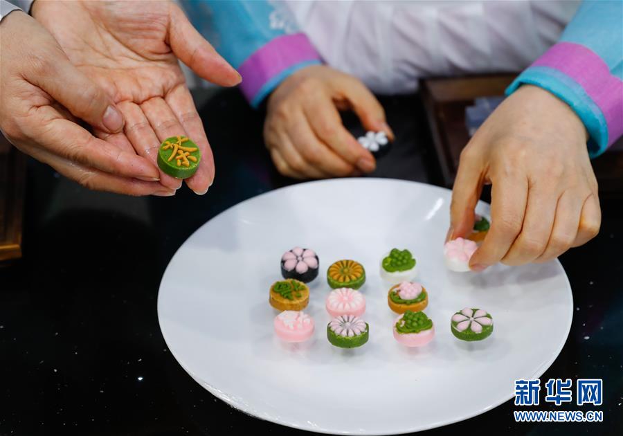 9月10日,在位于韩国首尔的韩国传统饮食研究所,所长尹淑子(右)和徒弟将压制好的茶食摆盘。新华社记者王婧嫱摄