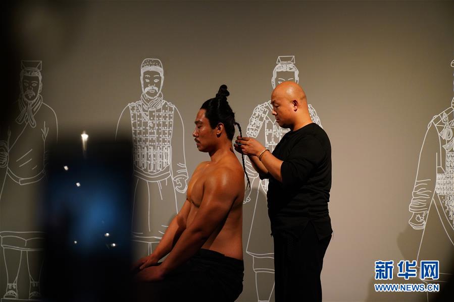 9月10日,演员在特展上演出行为艺术作品《给兵马俑梳头》。新华社记者 吴建路 摄