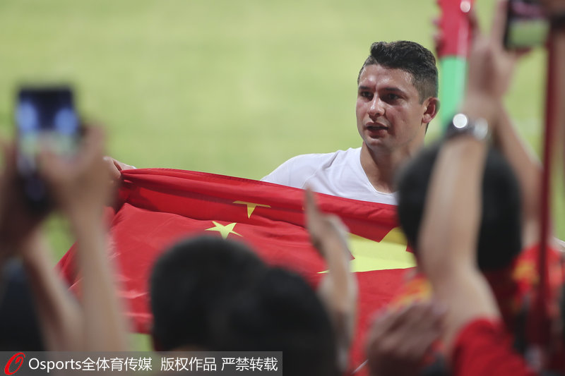 人民网北京9月11日电 北京时间今天凌晨,中国队在世预赛40强赛中5-0战胜马尔代夫。赛后,艾克森和另一位归化球员李可来到场边感谢中国球迷,面对球迷们赠与的国旗,艾克森毫不犹豫披在身上。
