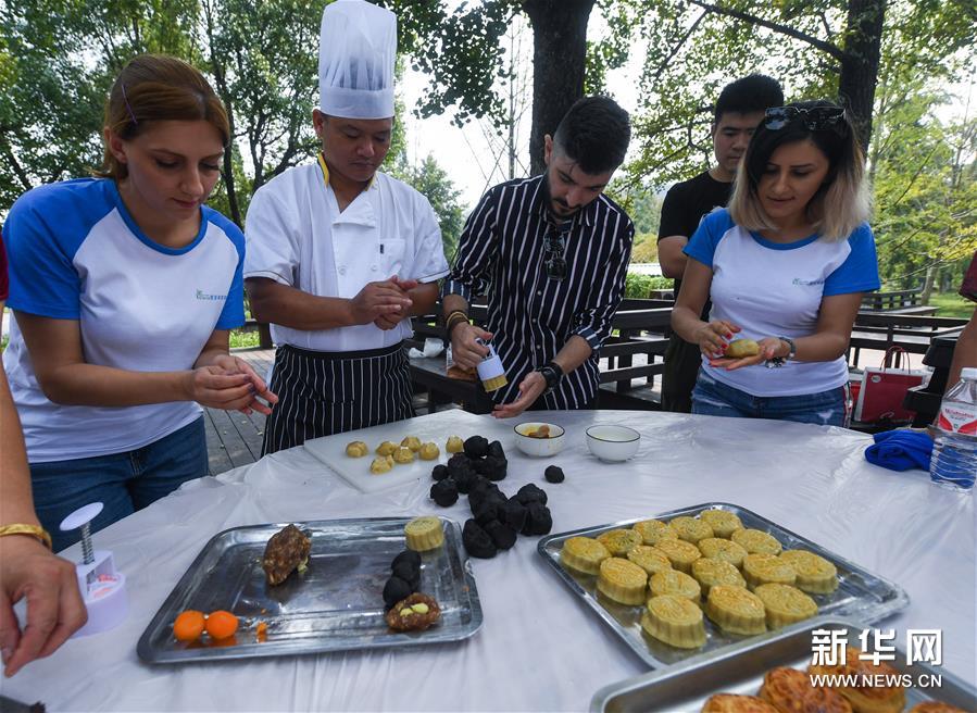 9月11日,几名外国友人在学做月饼。新华社记者 徐昱 摄