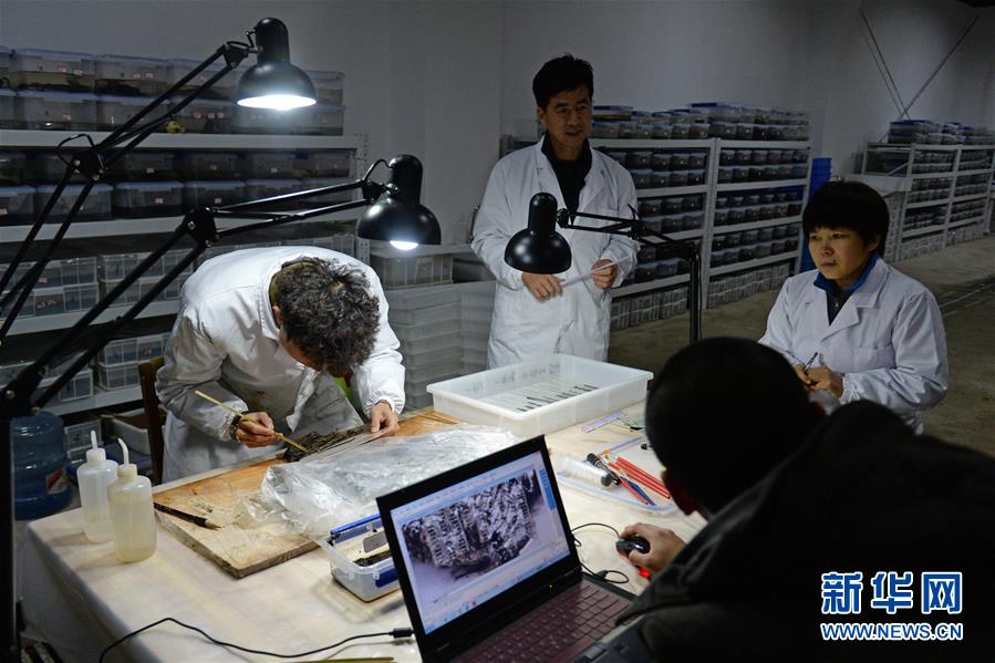 文保人员在江西南昌西汉海昏侯墓遗址文保用房内对出土的竹简进行剥离(2015年11月24日摄)。 新华社记者 万象 摄