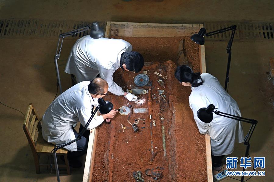 考古工作人员对江西南昌西汉海昏侯墓园五号墓的内棺进行清理工作(2018年1月25日摄)。 新华社记者 万象 摄