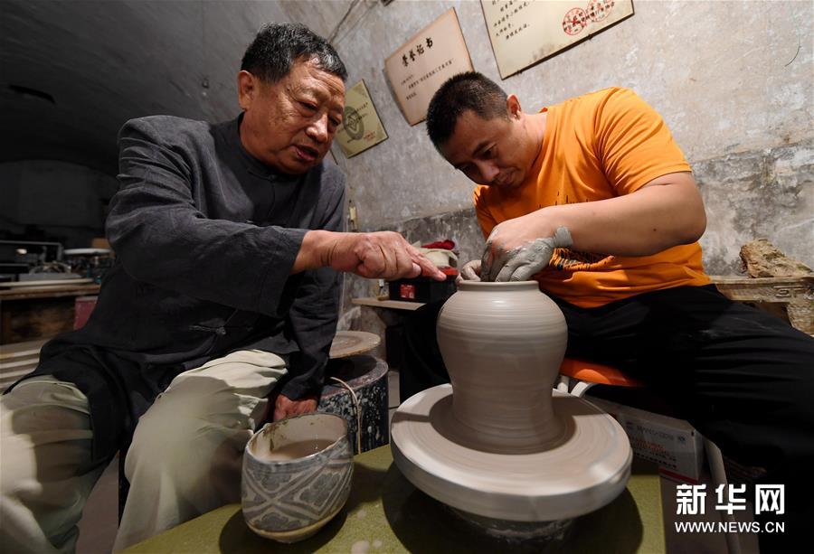 9月12日,在河北邯郸市峰峰矿区磁州窑盐店遗址博物馆制作工坊,刘立忠在指导大儿子刘鹏润(右)拉坯。 今年75岁的刘立忠是第一批国家级非物质文化遗产项目磁州窑烧制技艺代表性传承人,磁州窑盐店遗址博物馆馆长。出身于陶瓷世家的刘立忠是家族第四代传人。从艺以来,他一直致力于传统工艺的抢救与研究工作。经过他的整理与挖掘,传统磁州窑烧制的72道工序被完整地保存、延续下来,还有二十多项已经失传的装饰技艺也得到恢复。 磁州窑是我国北方的民窑体系,是古代民间窑场的杰出代表。为了更好地传承磁州窑文化与技艺,刘立忠先后收徒超过百人,向年轻人传授磁州窑烧制的传统工艺流程。“我的梦想就是让磁州窑窑火生生不息传承下去,发扬光大。” 刘立忠说。 新华社记者 王晓 摄