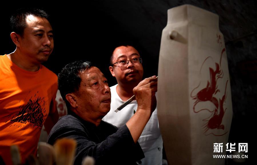 9月12日,在河北邯郸市峰峰矿区磁州窑盐店遗址博物馆制作工坊,刘立忠(中)指导大儿子刘鹏润(左)和二儿子刘鹏举在坯体上彩绘。 今年75岁的刘立忠是第一批国家级非物质文化遗产项目磁州窑烧制技艺代表性传承人,磁州窑盐店遗址博物馆馆长。出身于陶瓷世家的刘立忠是家族第四代传人。从艺以来,他一直致力于传统工艺的抢救与研究工作。经过他的整理与挖掘,传统磁州窑烧制的72道工序被完整地保存、延续下来,还有二十多项已经失传的装饰技艺也得到恢复。 磁州窑是我国北方的民窑体系,是古代民间窑场的杰出代表。为了更好地传承磁州窑文化与技艺,刘立忠先后收徒超过百人,向年轻人传授磁州窑烧制的传统工艺流程。“我的梦想就是让磁州窑窑火生生不息传承下去,发扬光大。” 刘立忠说。 新华社记者 王晓 摄
