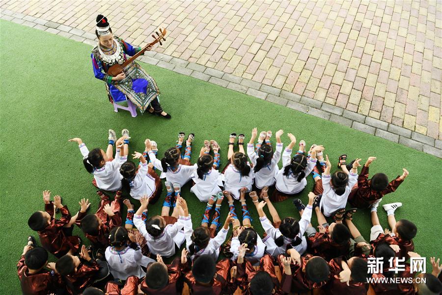 9月18日,贵州省榕江县古州镇中心幼儿园的老师教孩子们唱侗族琵琶歌。 近年来,贵州省黔东南苗族侗族自治州榕江县在幼儿园、民族中小学积极开展民族民间文化进校园活动,开设侗族琵琶歌、侗族大歌、蜡染等传承班和课外兴趣小组,让孩子们从小接受民族文化的熏陶。 新华社记者 杨文斌 摄