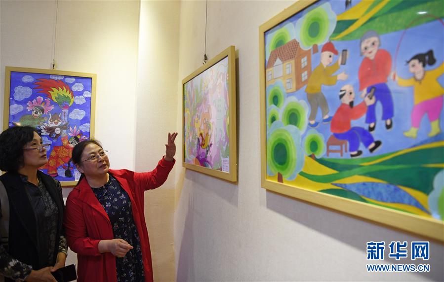 9月23日,观众在展览现场参观。 当日是“中国农民丰收节”,山西省运城市举办首届农民画展,共展出运城市各县(区)28位农民画家的80余幅作品,吸引众多市民前来参观。 新华社记者 杨晨光 摄