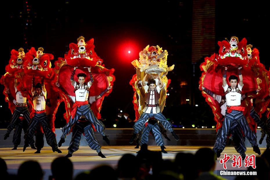 9月28日晚,演员表演舞剧《醒·狮》选段。当日,“我和我的祖国——广州庆祝中华人民共和国成立70周年文艺晚会”在广州塔下举行。晚会现场70头醒狮亮相舞台,70架钢琴一同奏响,带来了一场视觉盛宴。中新社记者 姬东 摄