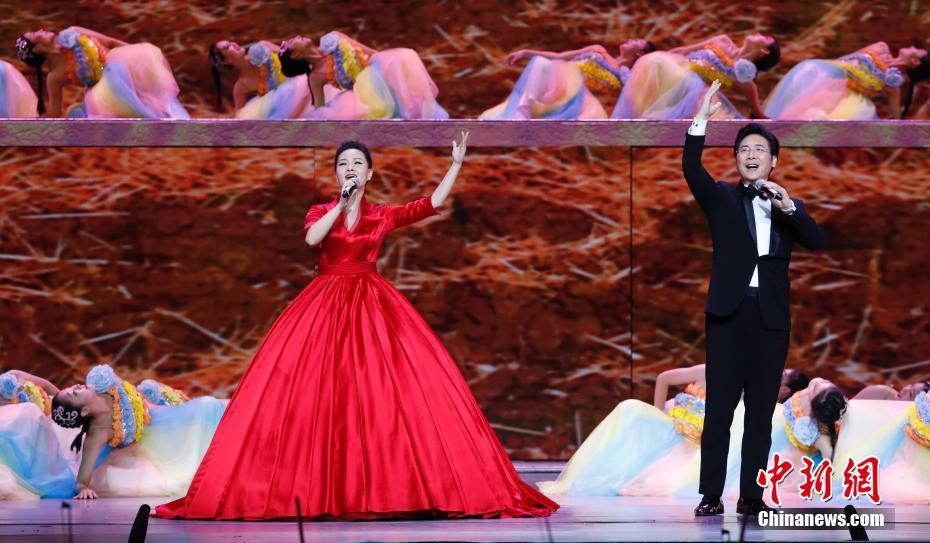 9月29日晚,庆祝中华人民共和国成立70周年大型文艺晚会《奋斗吧 中华儿女》在北京人民大会堂举行。图为廖昌永、雷佳演唱《赤子》。中新社记者 杜洋 摄