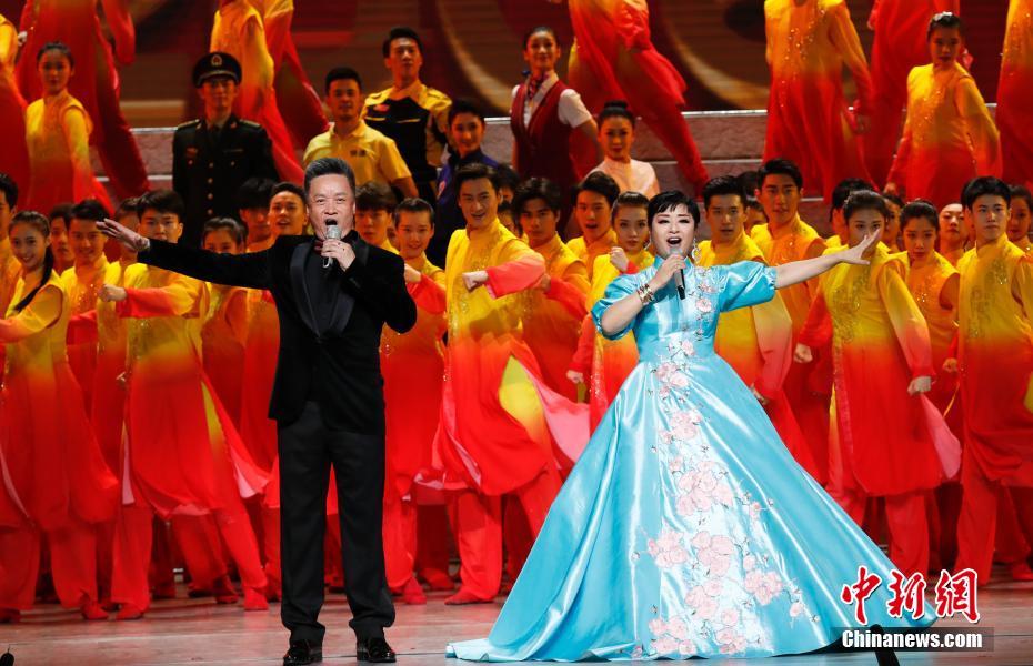 9月29日晚,庆祝中华人民共和国成立70周年大型文艺晚会《奋斗吧 中华儿女》在北京人民大会堂举行。图为殷秀梅、阎维文演唱《复兴的力量》。中新社记者 杜洋 摄