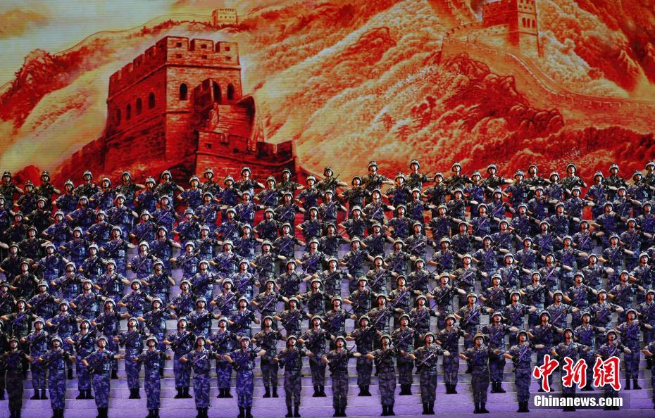 9月29日晚,庆祝中华人民共和国成立70周年大型文艺晚会《奋斗吧 中华儿女》在北京人民大会堂举行。图为第四篇章“奋斗吧 中华儿女”《强军战歌》。中新社记者 杜洋 摄