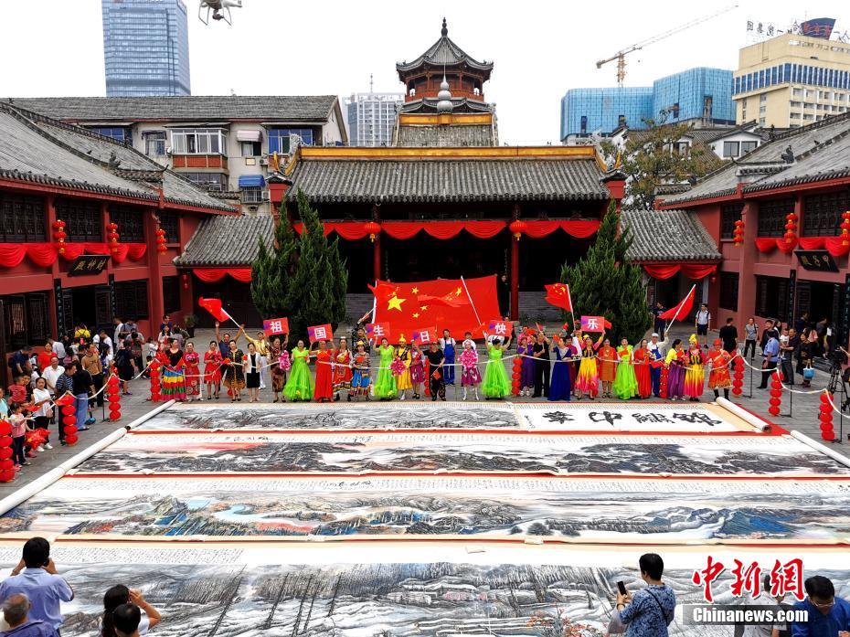 10月2日,安徽合肥庐州府城隍庙展出450米长卷巨画《锦绣中华》。《锦绣中华》的作者是吴大千,画面总长为450米,画高2.5米,其中名山142座,江河湖泊47条,该画卷融绘画艺术、书法艺术、金石篆刻艺术和文学艺术于一体。图为文艺工作者在巨画前歌唱。中新社记者 韩苏原 摄