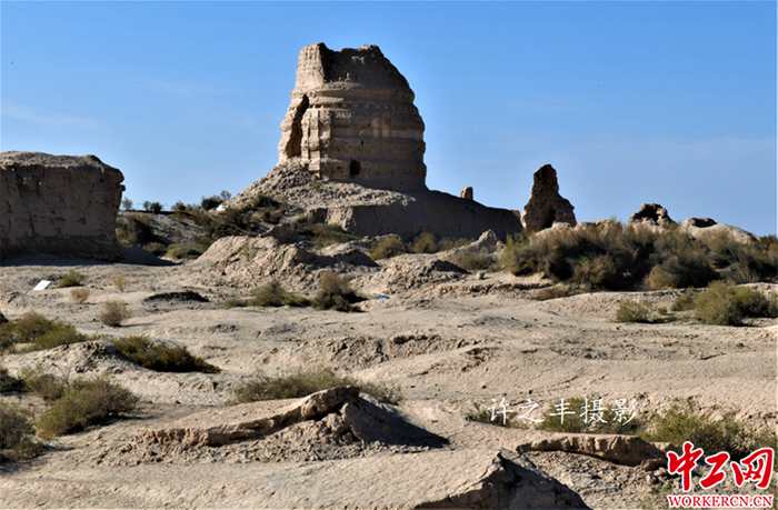 2019年9月30日,沿着古长城西行,走进甘肃瓜州锁阳城遗址,亦称“瓜州古城”。是集古城址、古河道、古寺院、古墓葬、古垦区等为一体的古文化遗存地。遗址结构可分为内外两城,将内城包围,墙体高大;内城面积28万平方米,城墙夯土版筑,底宽7.5米,顶宽4.6米,高10米,四角有角墩,结构极其复杂,城内留有大量土台、房屋及其它建筑物遗迹。这里的古代军事防御系统和烽燧信息传递系统是我国保存最为完好的典型范本,也是河西走廊规模较大保存完整的一座古城遗址。工人日报-中工网许之丰摄影报道