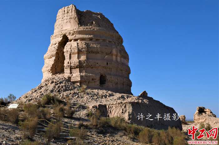 2019年9月30日,沿着古长城西行,走进甘肃瓜州锁阳城遗址,亦称“瓜州古城”。是集古城址、古河道、古寺院、古墓葬、古垦区等为一体的古文化遗存地。遗址结构可分为内外两城,将内城包围,墙体高大;内城面积28万平方米,城墙夯土版筑,底宽7.5米,顶宽4.6米,高10米,四角有角墩,结构极其复杂,城内留有大量土台、房屋及其它建筑物遗迹。这里的古代军事防御系统和烽燧信息传递系统是我国保存最为完好的典型范本,也是河西走廊规模较大保存完整的一座古城遗址。工人日报-中工网许之丰摄影报道